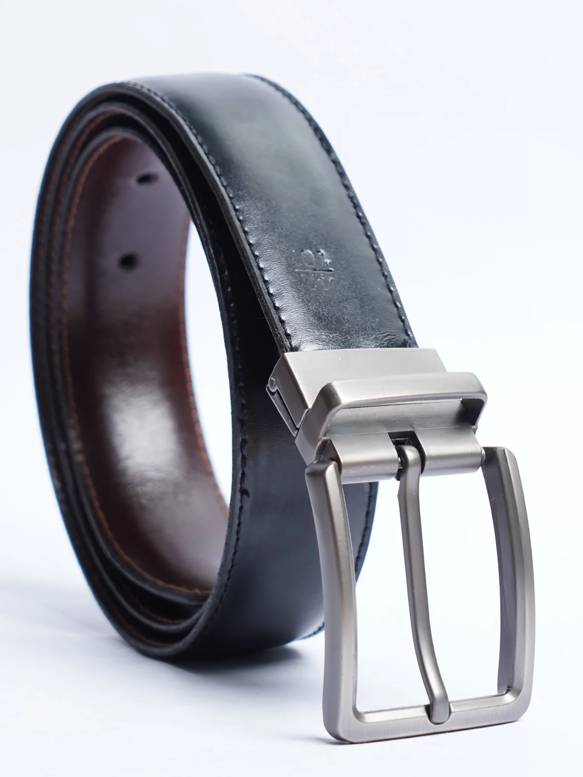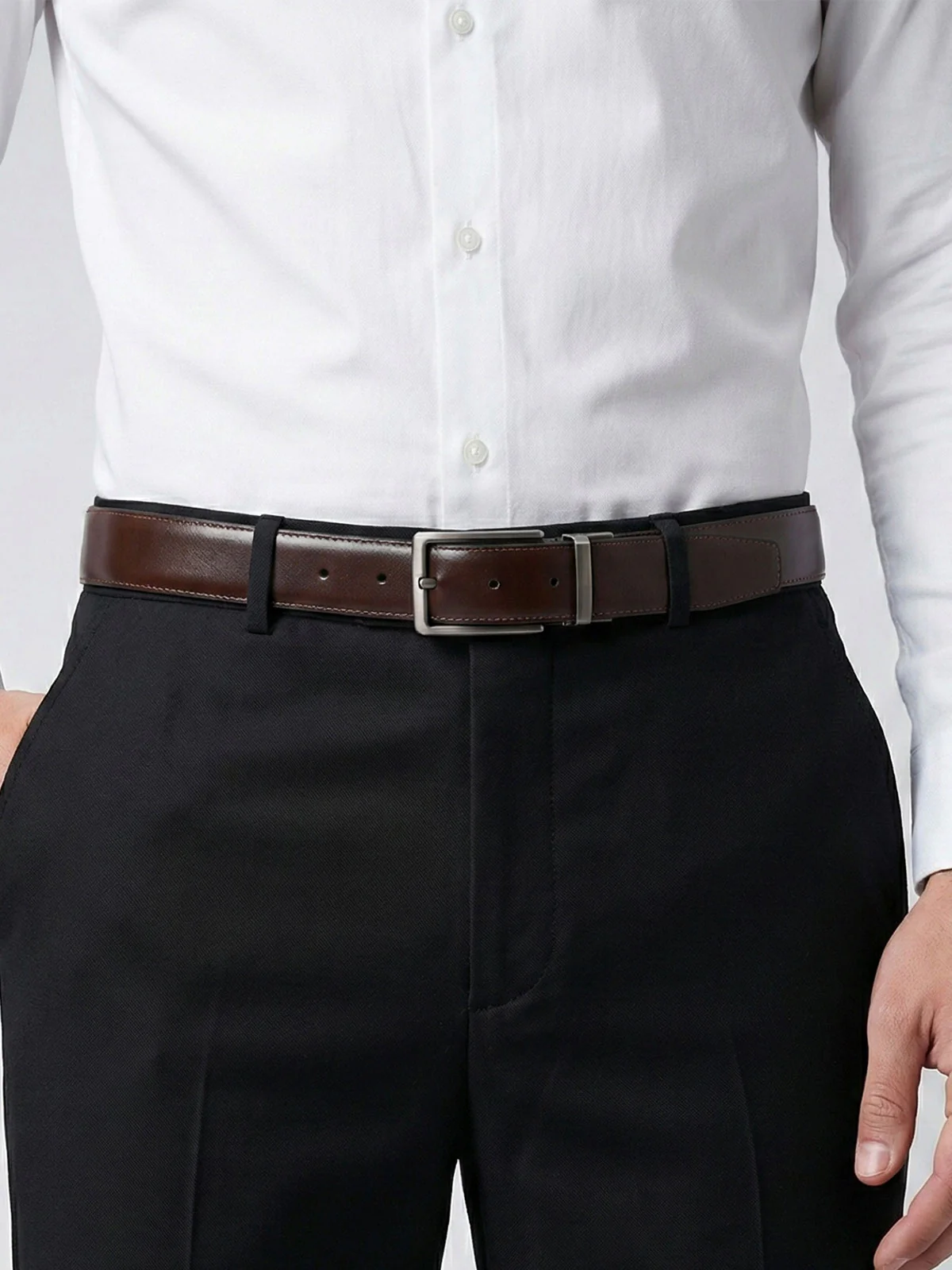 A versatile accessory designed for modern men, this reversible belt offers both dark brown and black leather finishes, allowing effortless switching between formal and casual looks. Crafted from durable leather, it combines functionality with a sleek, polished design.