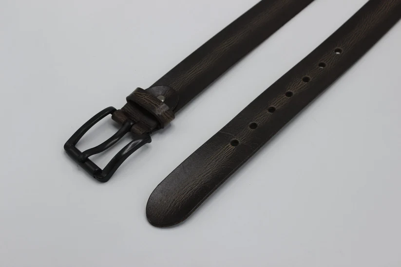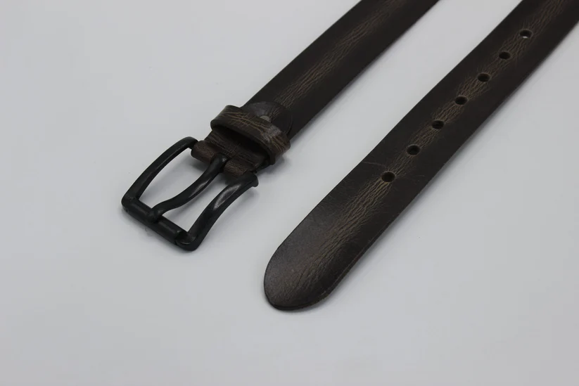 A refined dark brown leather belt featuring a sleek black buckle, offering a modern and versatile accessory for both casual and formal wear. Built for durability and effortless style.